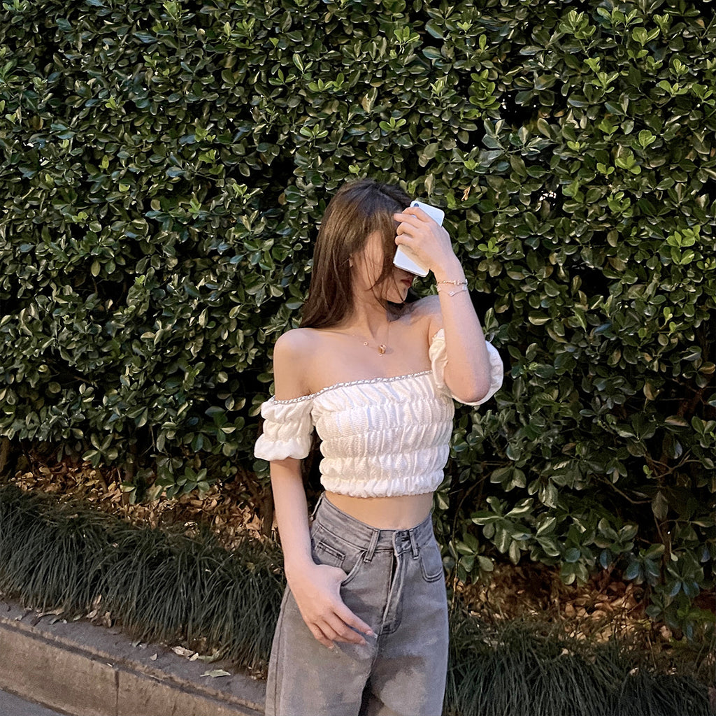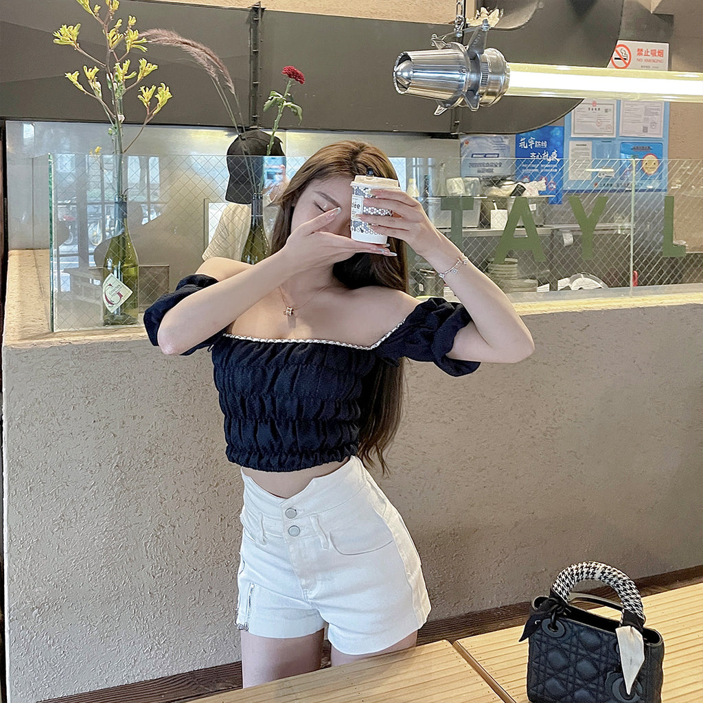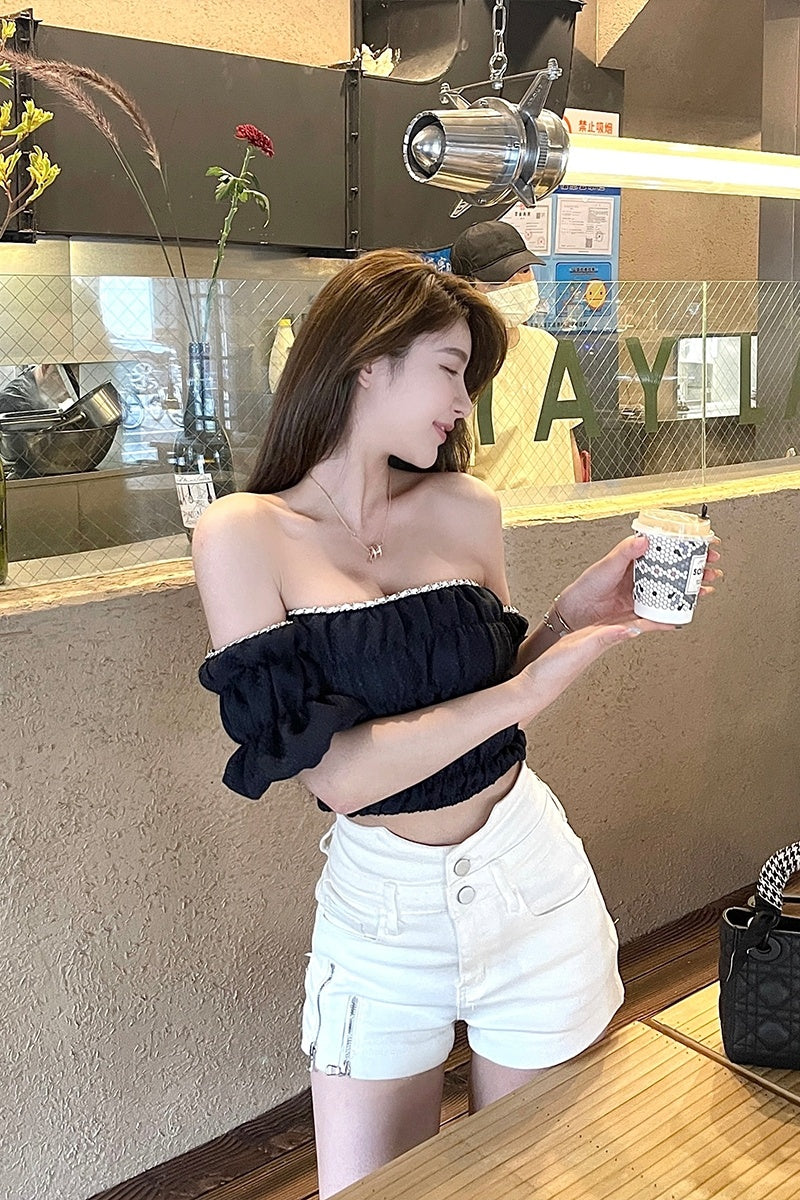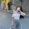 Xiyao Tibetan blue white short sleeve T-shirt women''s summer new pure desire style design sense one shoulder short vest top